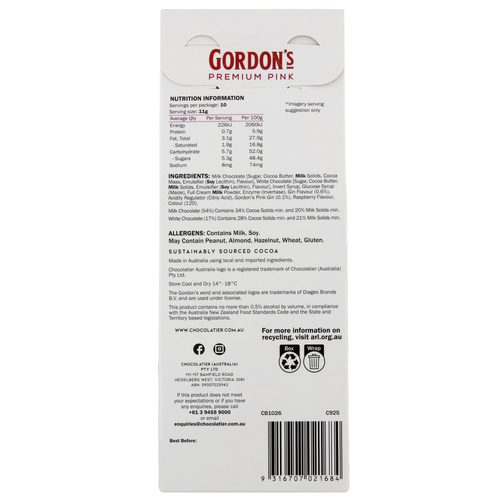 | Ingredients | Milk Chocolate Sugar, Cocoa Butter, Milk Solids, Cocoa Mass, Emulsifier (Soy Lecithin), Flavour, White Chocolate Sugar, Cocoa Butter, Milk Solids, Emulsifier (Soy Lecithin), Flavour, Invert Syrup, Glucose Syrup (Maize), Full Cream Milk Powder, Enzyme (Invertase), Gin Flavour, Acidity Regulator (Citric Acid), Gordon's Pink Gin, Raspberry Flavour, Colour (120). GordonÕs Gin Chocolate Cup Contains 0.5% alcohol by volume. Milk Chocolate (54%) Contains 34% Cocoa Solids min. and 20% Milk Solids min. White Chocolate (17%) Contains 28% Cocoa Solids min. and 21% Milk Solids min. |