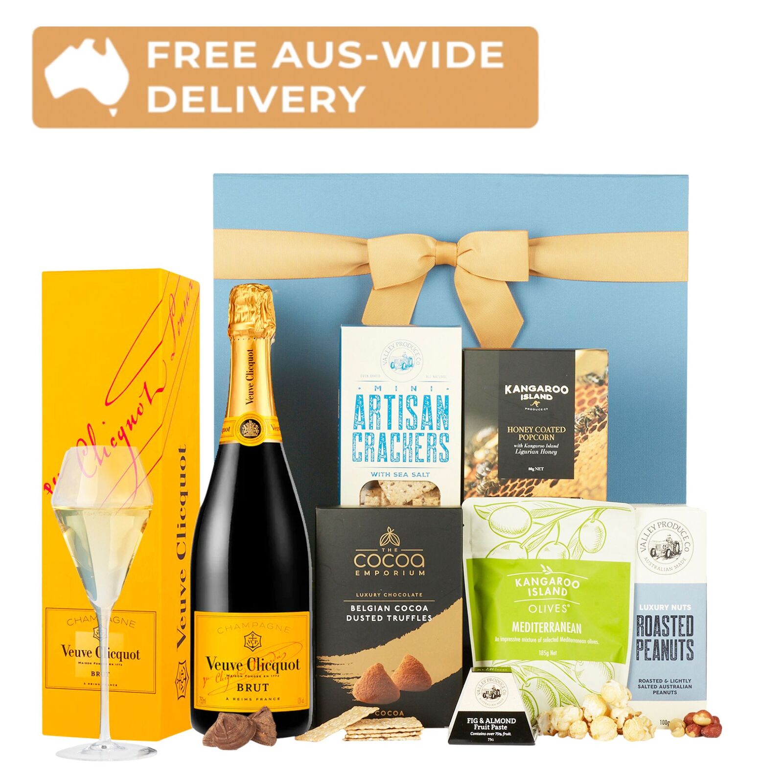 This exquisite hamper combines Veuve Cliquot Champagne with a selection of gourmet delights like gourmet chocolates, nuts, olives, crackers, fruit paste and more. Perfect for a lavish treat.