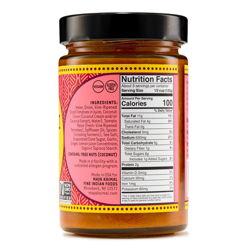 Water Onion, Vine-Ripened Diced Tomatoes in Juice, Coconut Cream (Coconut Cream and/or Coconut Extract, Water), Tomato Paste (Fresh-Vine Ripened Tomatoes), Safflower Oil, Spices (including Turmeric), Sea Salt, Evaporated Cane Sugar, Garlic, Ginger, Lemon Juice Concentrate, Organic Tapioca Starch.
