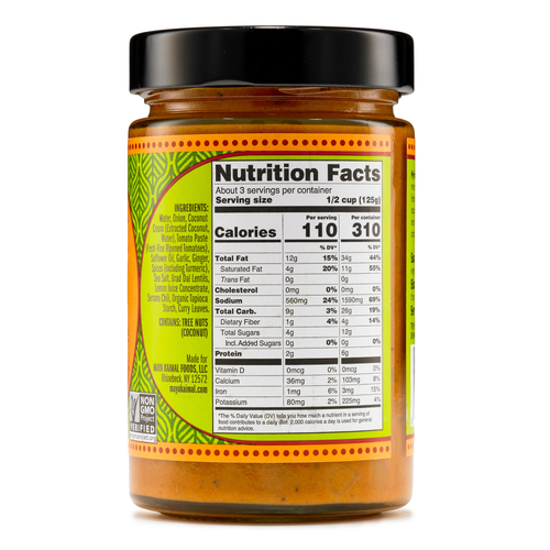 Water, Onion, Coconut Cream (Coconut Cream and/or Coconut Extract, Water), Tomato Paste (Fresh-Vine Ripened Tomatoes), Safflower Oil, Garlic, Ginger, Spices (including Turmeric), Sea Salt, Urad Dal Lentils, Lemon Juice Concentrate, Serrano Chili, Organic Tapioca Starch, Curry Leaves. Contains: Tree Nuts (Coconut)