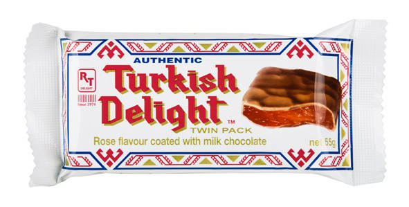 turkish delight 85%, (sugar, wheat starch, what glucose syrup, food acid (330, 336), colour (120), flavour, water), milk chocolate 15%, (sugar, cocoa mass, whey powder, emulsifier (soya lecithin, 476), vanillin, milk chocolate contains cocoa solids (30%), milk solids (15%), contains gluten, May contain: traces of tree nuts