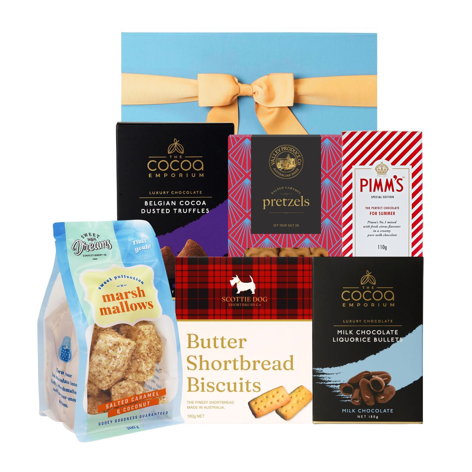 Our stunning French Blue Gourmet Hamper Box is sure to impress and is finished with quality gold ribbon.